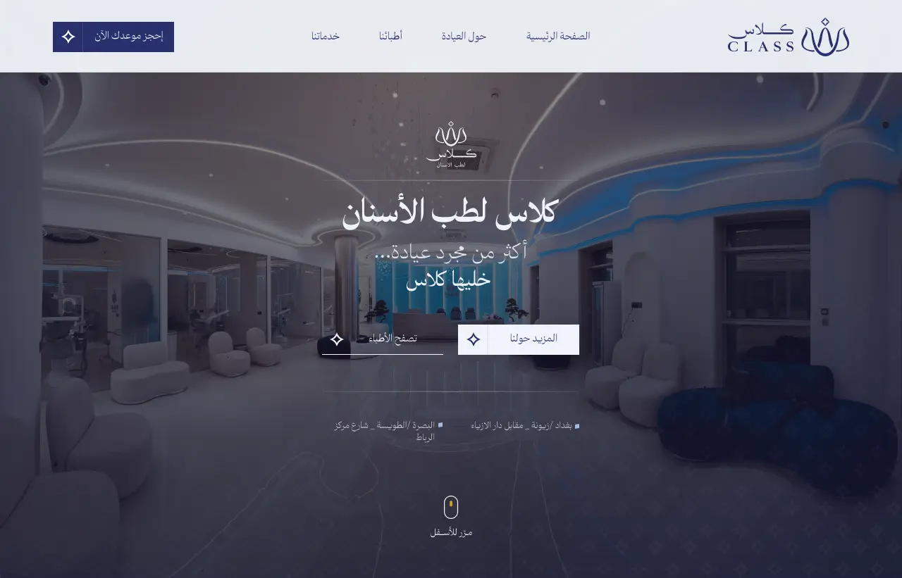 Class Dental Clinic website was built to showcase the clinic's information, doctors, appointments, and contact details. All pages were designed following the clinic's brand identity, with a clear structure that makes it easy for patients to navigate and find what they need. The website includes 3 main pages: a Home page that highlights the clinic's key information including the doctors available in both Baghdad and Basra branches, a Doctor page that displays each doctor's CV, education, cases, and patient reviews where each case is presented in a layout suited to its content type with case image zooming and more, and a Service page that breaks down the clinic's expertise in each service supported by real cases related to that service.